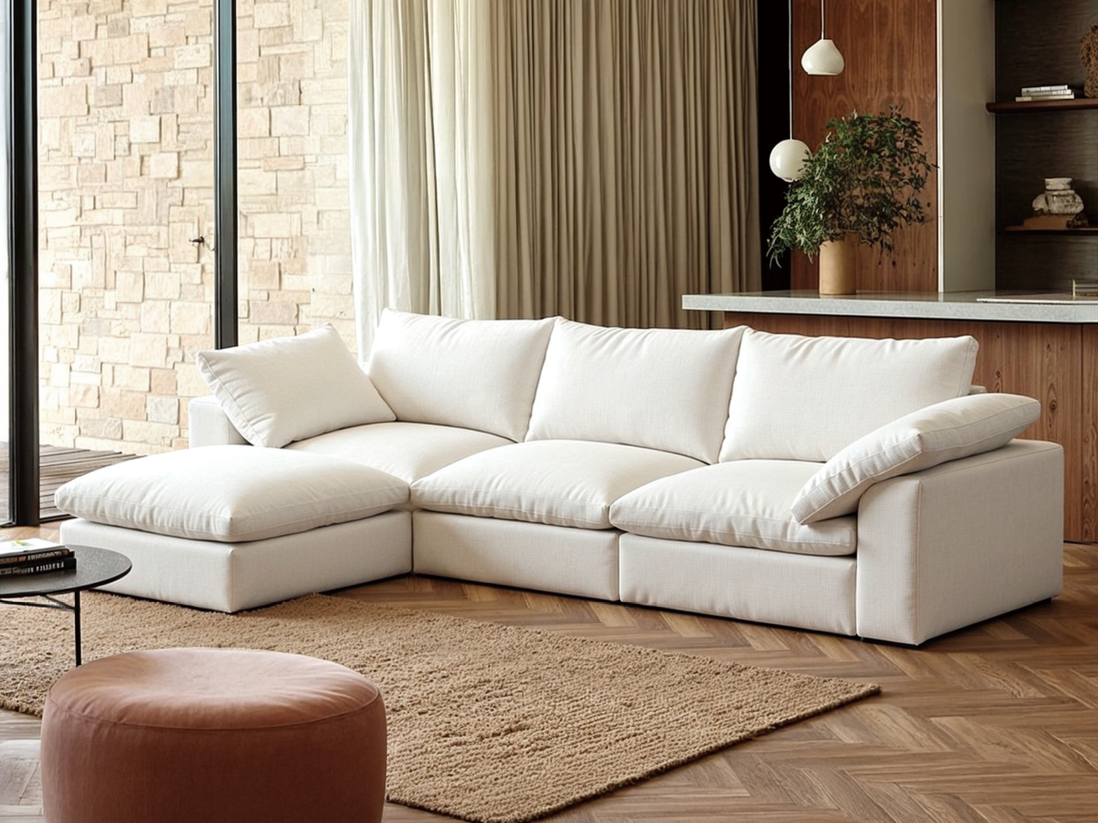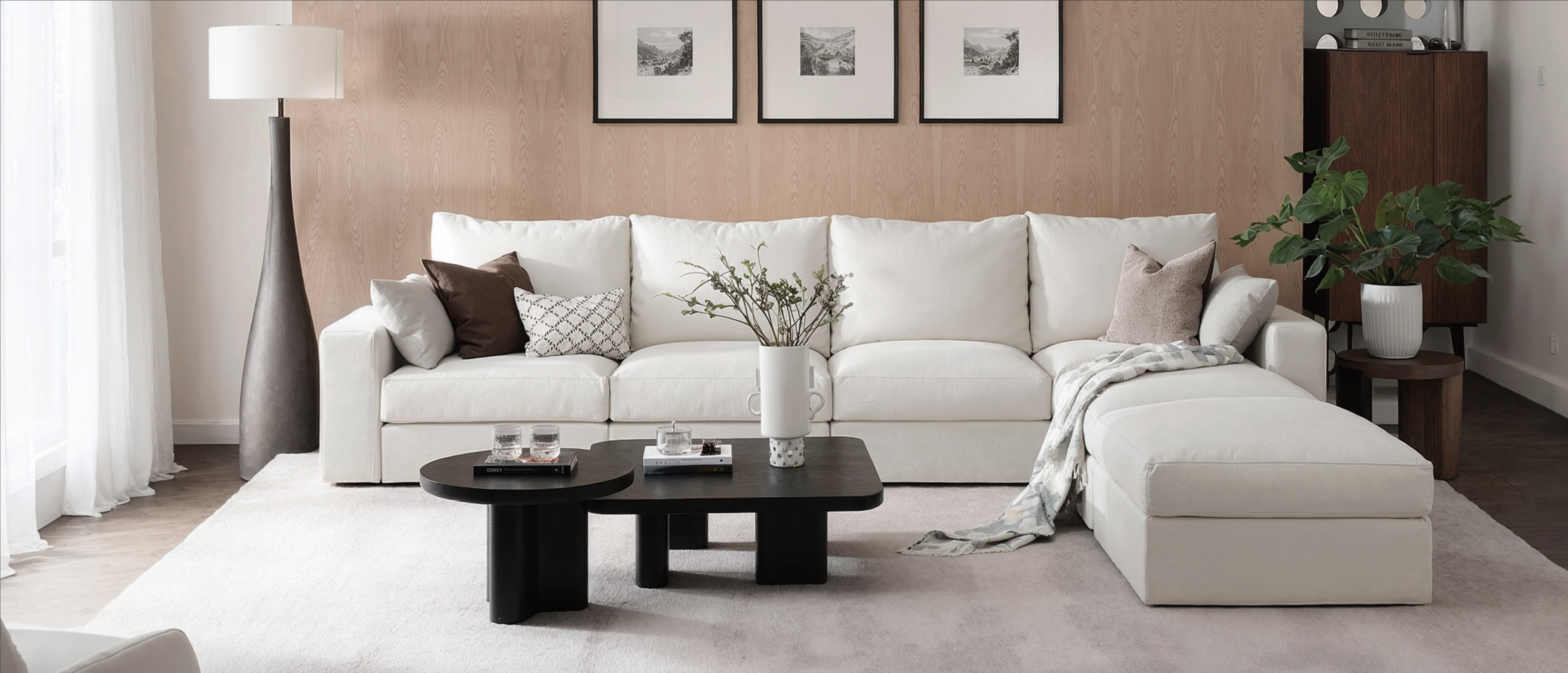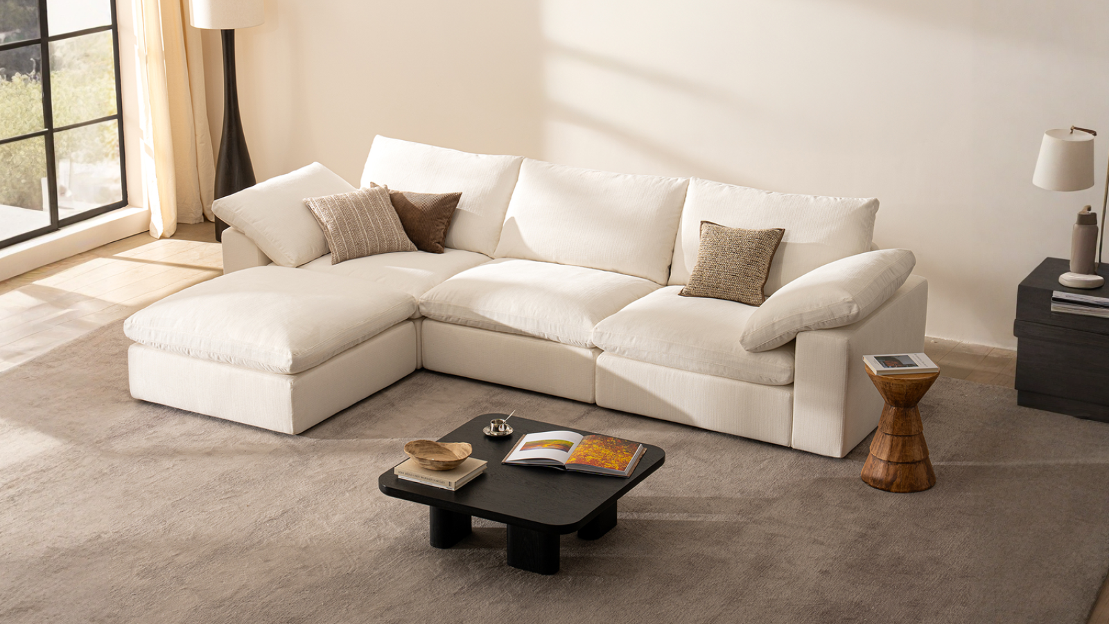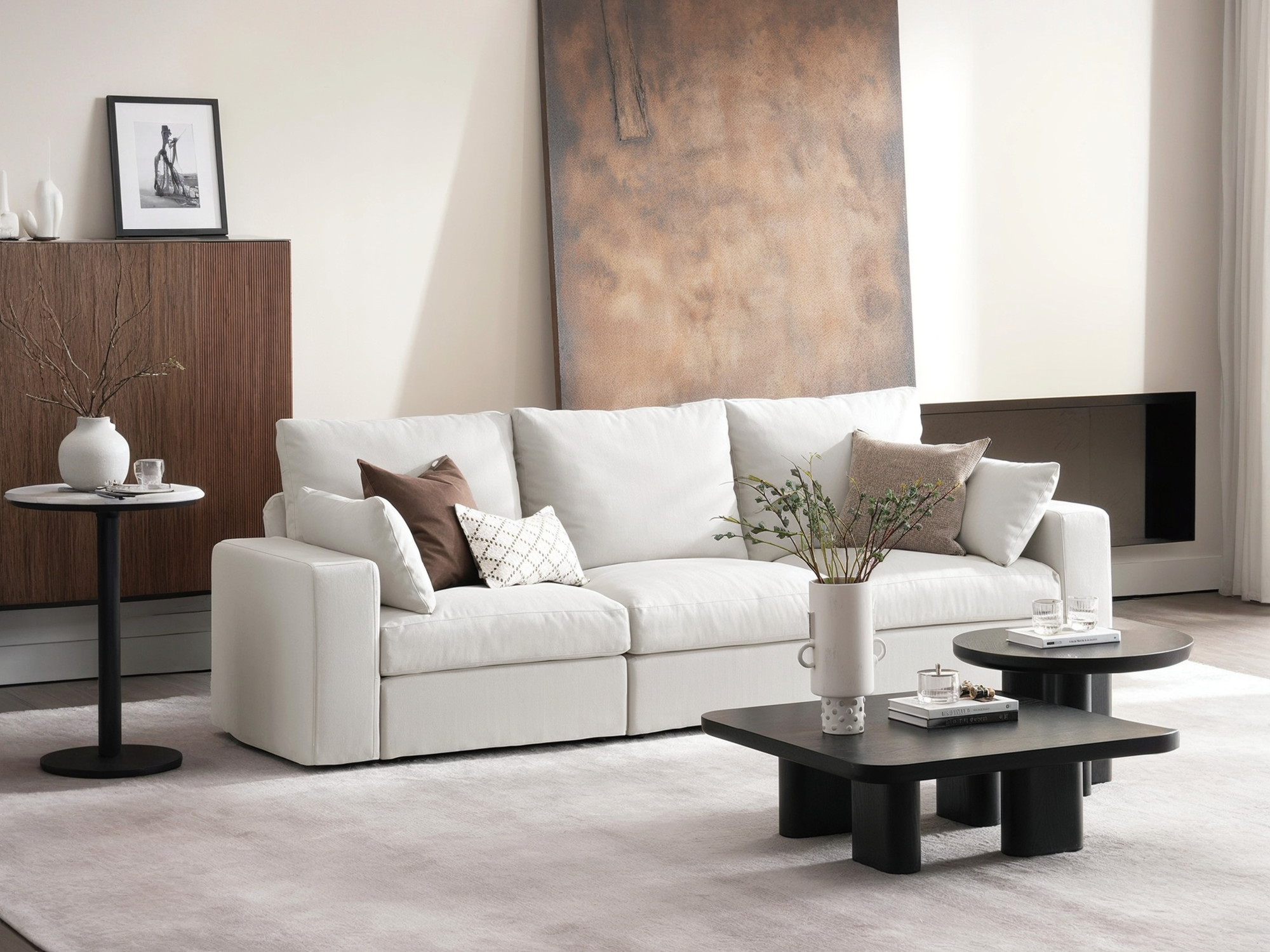 Snap-together modules with washable covers ensure durable, customizable living room layouts.