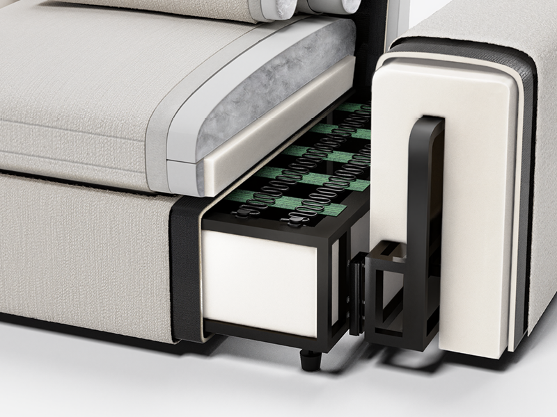 A recycled-metal frame combined with sinuous springs creates an ultra-strong, ultra-durable support system.