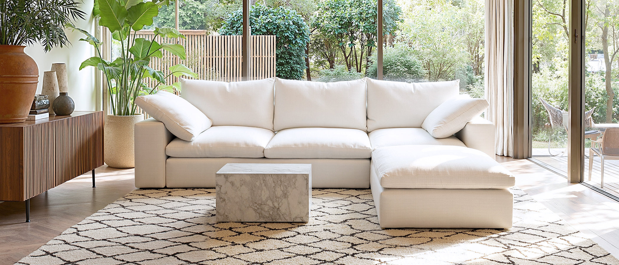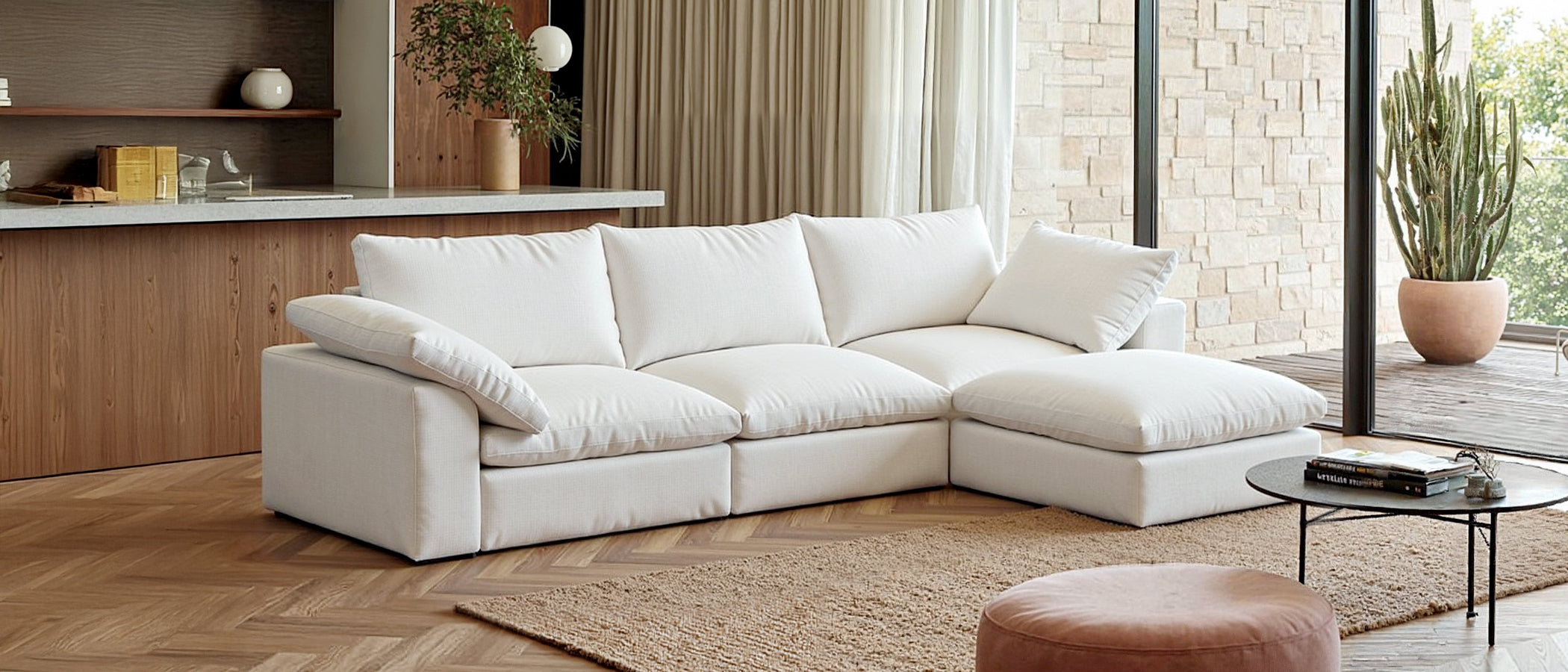 Every seat and back cushion is filled with over 70 % impeccably sanitized white goose down, boasting 700 fill-power loft.